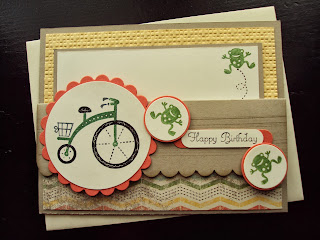 Cut Very Vanilla at 4 1/8 x 5 3/8 and 3/8 x 2 (for small flag), Pistachio Pudding at 4 1/4 x 11 (score 5 1/2) and two 2 3/8 x 4 3/8, two DSP at 2 1/4 x 4 1/4. Emboss largest Very Vanilla piece, and with dauber ink edges of Very vanilla and DSP pieces. On lightest DSP Stamp in Soft Suede flower stems and then in Island Indigo stamp flower tops. Stamp greeting in Soft Suede above flower. Assemble the two DSP panels. On the panel with flowers tie ribbon on lower portion. Then on Very Vanilla strip Take stamp from Lots of Thanks and just ink (so much) on the stamp with Island Indigo marker and stamp it on the left side of 2 inch strip leaving enough room to make a pennant cut. Attach to DSP panel with flowers even with ribbon. On scrap piece of Very Vanilla stamp with French Foliage stamp using Pistachio Pudding and Island Indigo ink randomly stamp area big enough to use butterfly punch, then ink edges with Soft Suede. Assemble card as shown above no dimensionals are used just tape. Then with glue pen dot the flower tops randomly then sprinkle with Dazzling Diamonds. Attach butterfly and your done.